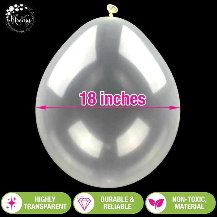 Elevate your event décor and balloon stuffing projects with our Pro-Grade 18-Inch Clear Latex Balloons, designed for use with Bloonsy stuffing machines and compatible with most other models. These highly transparent balloons offer exceptional quality and durability, making them the professional’s choice for creating stunning displays.